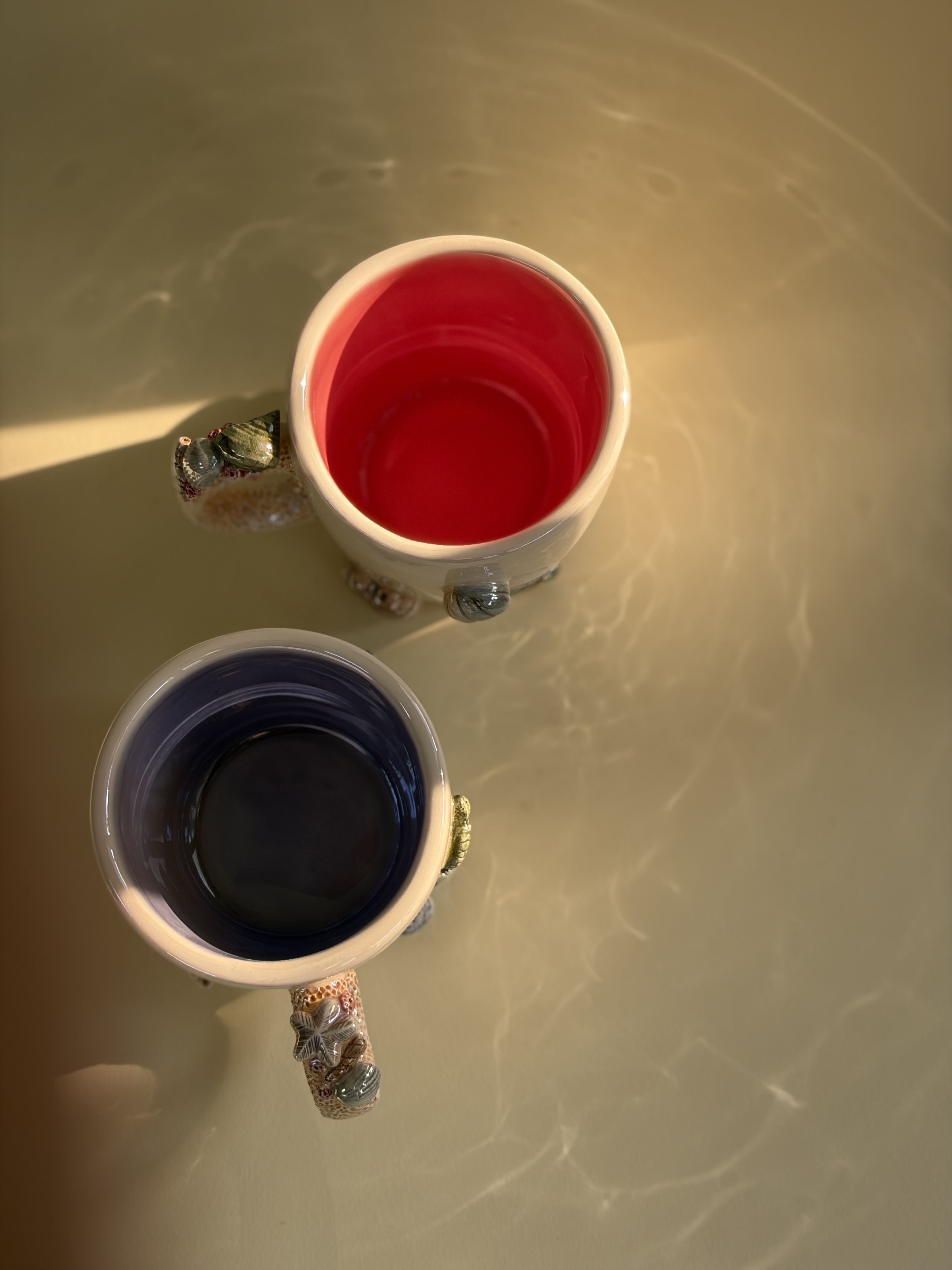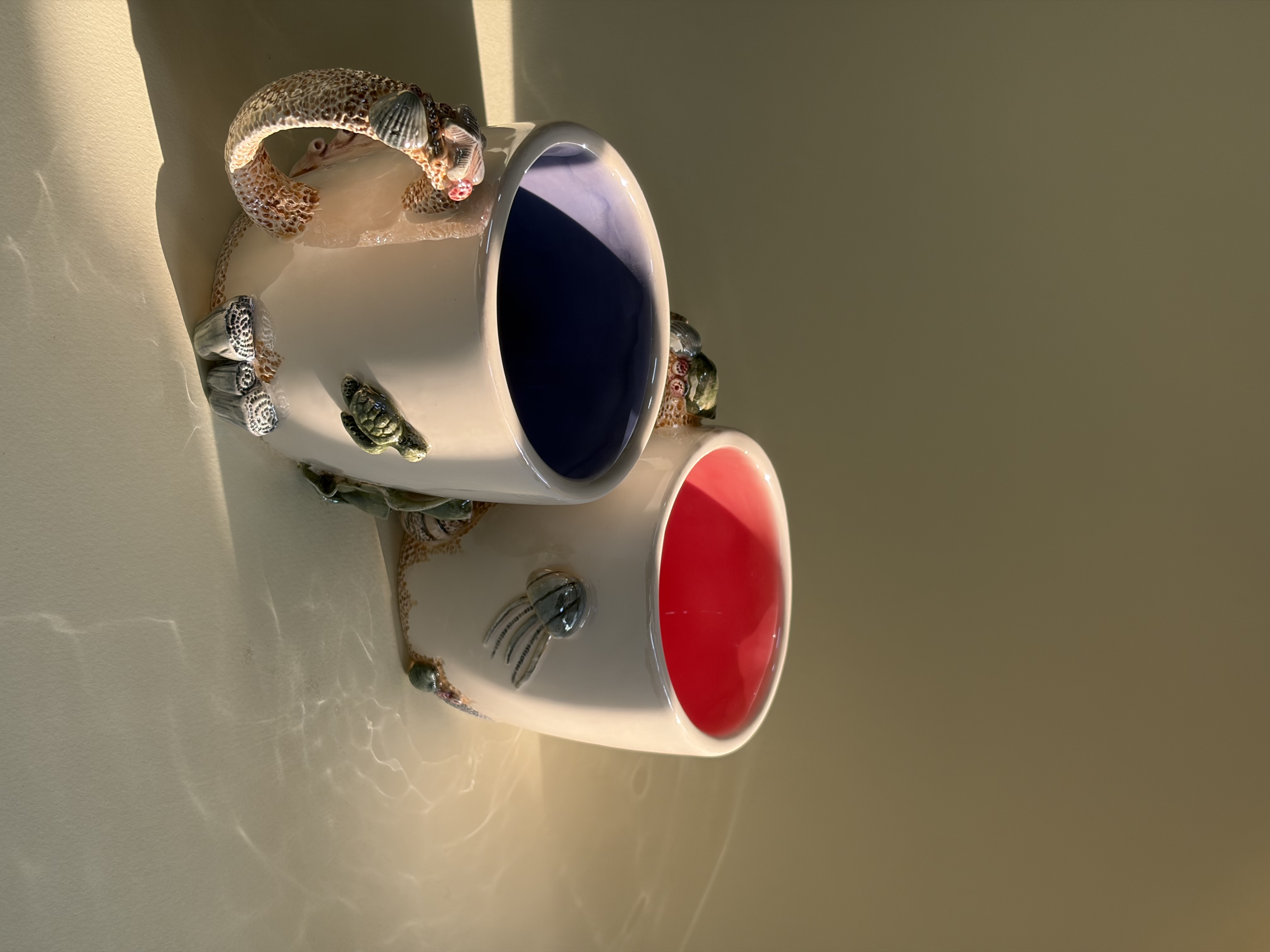 ماگ سرامیکی دریایی دارای لاستر صدفی و طراحی برجسته و دست ساز